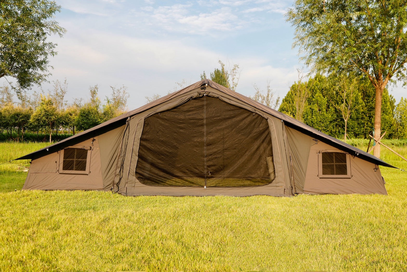 210g TCテクノロジーコットン(トヨタ自動織機製指定生地)、厚手PVCフロア、高透明TPU窓など、日本の四季に最適化された耐久仕様。